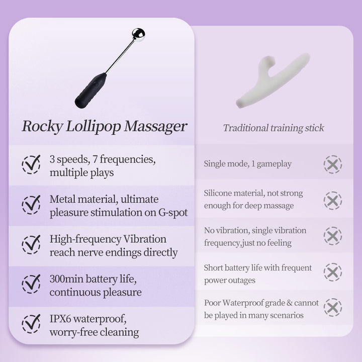 Ya sea como masajeador para uso individual o como juguete íntimo para parejas, el Rocky Lollipop Massager intensifica los juegos previos, el BDSM y las exploraciones sensuales con una potencia y precisión incomparables.